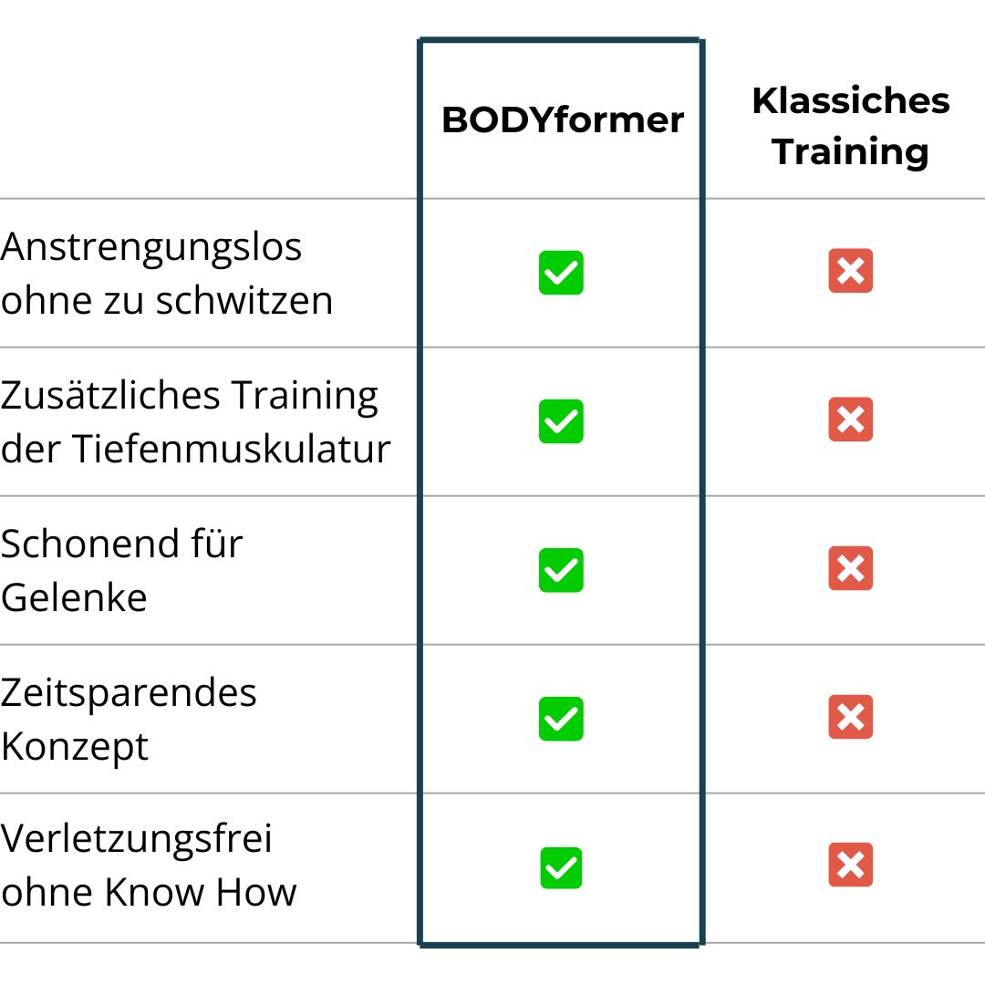 Der BODYformer ist eine bequeme und erschwingliche Wahl für alle, die ihre Gesundheit verbessern wollen. Er kann sowohl von Frauen als auch von Männern ab 18 Jahren benutzt werden. Über eventuelle Kontraindikationen wirst du vor Ort aufgeklärt.